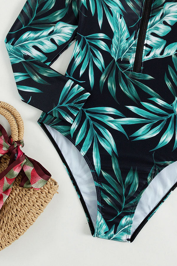 Plant Print Zipper Long Sleeve UPF50+ Rash Guard