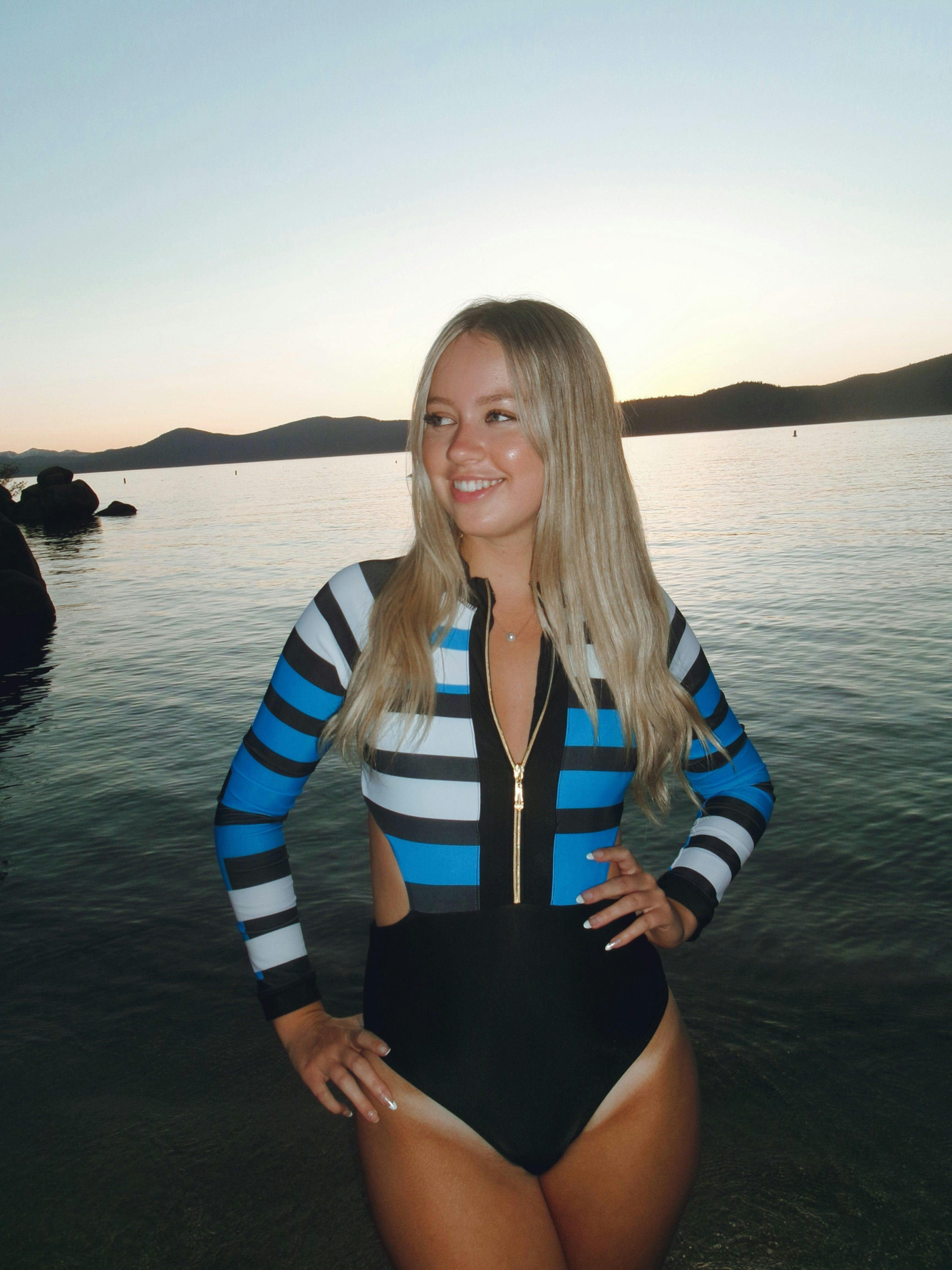 The high back at the leg and the soft cups offer additional support and coverage, while the cut-out at the waist adds a touch of style and sophistication to the swimsuit. Upgrade your swimwear collection with the Striped One Piece Rash Guard and experience the perfect combination of style, function, and sun protection. It's a must-have piece for any water-based adventure, providing both comfort and fashion in one.
